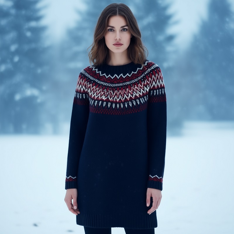 قد لباس بین ۸۰ تا ۸۵ سانتیمتر است و پوششی متعادل بین بلوز و بافت بلند ایجاد میکند؛ مناسب برای استفاده روزمره، محیطهای دوستانه یا دورهمیهای زمستانی.